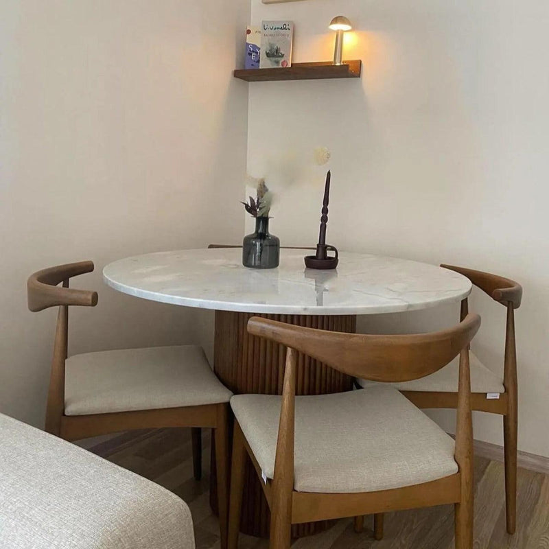 Table à Manger Ronde en Marbre Blanc et Bois Strié - Élégance et Modernité