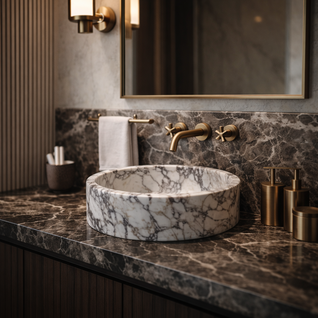 Chez Atelier Travertin, nous concevons des vasques professionnelles en marbre et travertin destinées aux hôtels, restaurants, établissements recevant du public et projets architecturaux.