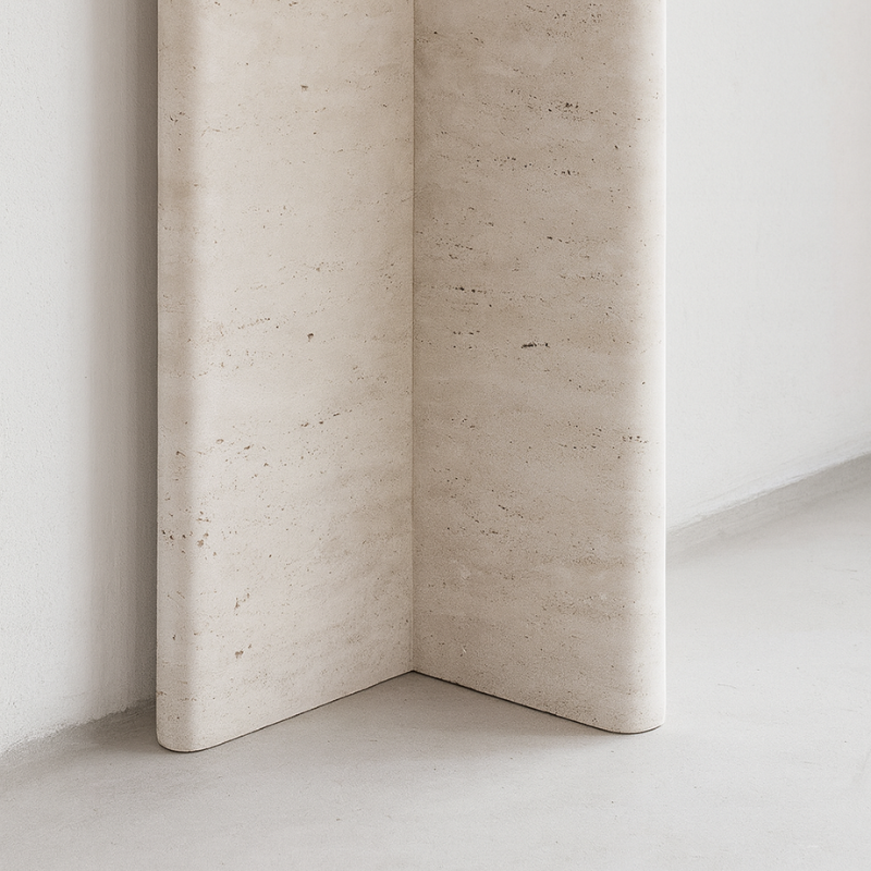 Pieds pleins en travertin : stabilité et présence affirmée.