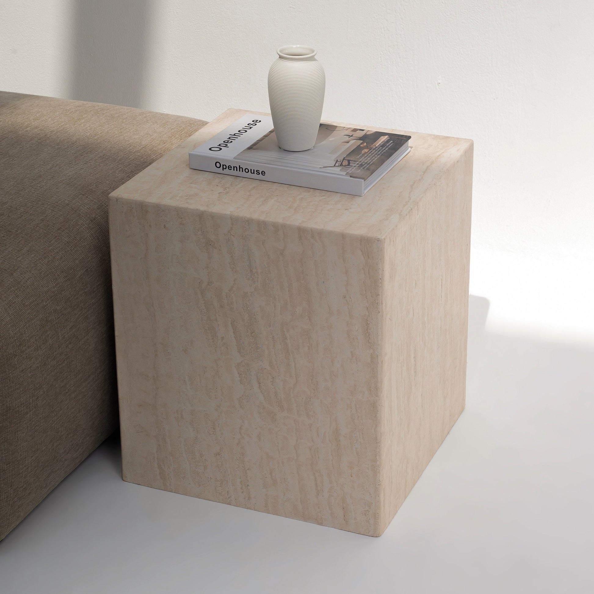 La table d’appoint séduit par sa forme cubique épurée et la beauté brute de son travertin naturel.