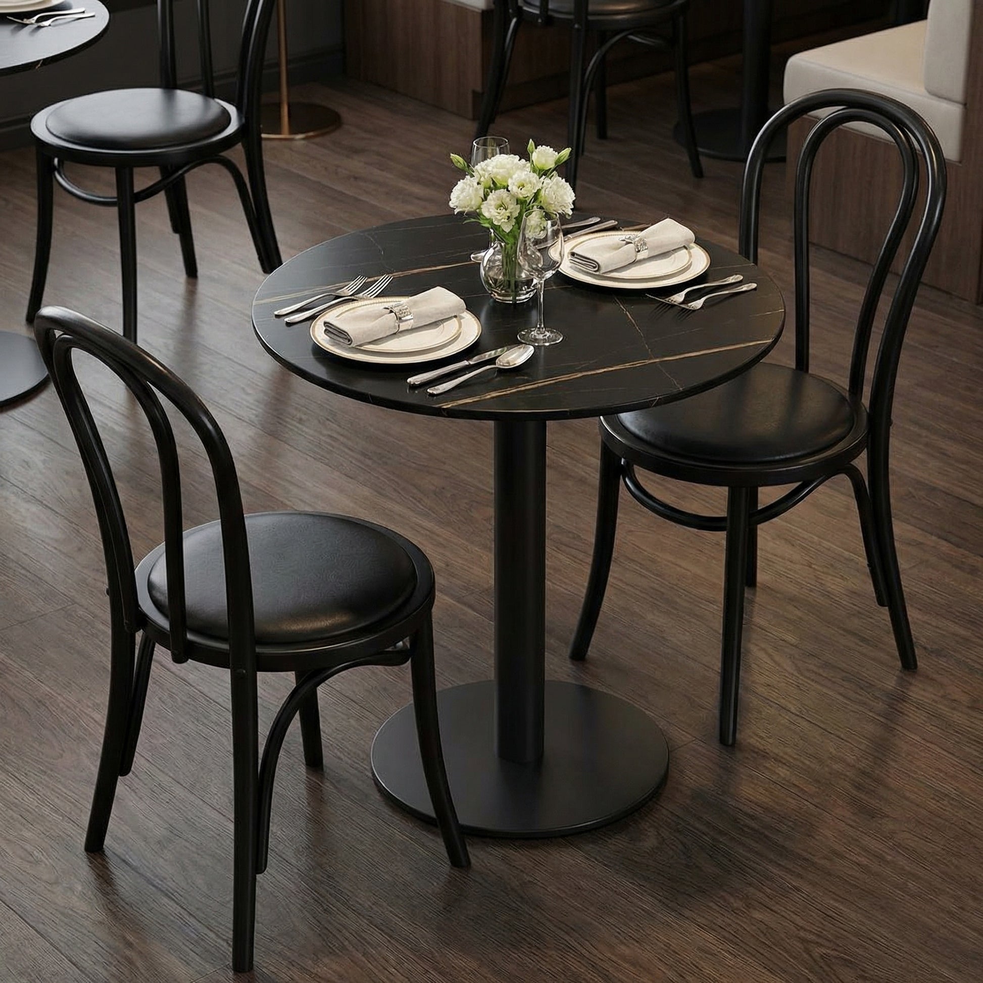 - Table bistrot ronde en marbre noir Ø60 cm, pensée pour la restauration